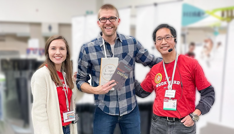 Gregory Coles (center) displays two of his books alongside staff from publisher InterVarsity Press at the 2022 Urbana Mission Conference. Greg Coles(Provided)