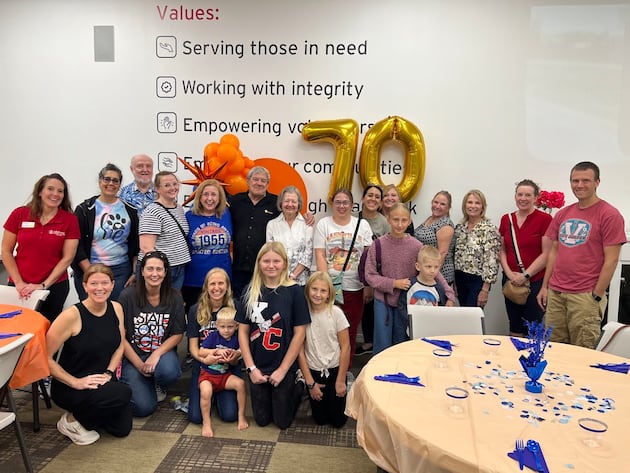 On October 18, 2025, the group, which Fulmer estimated to number around 35 people, enjoyed cake and ice cream together after labeling canned peaches and packing snack bags for the food bank.